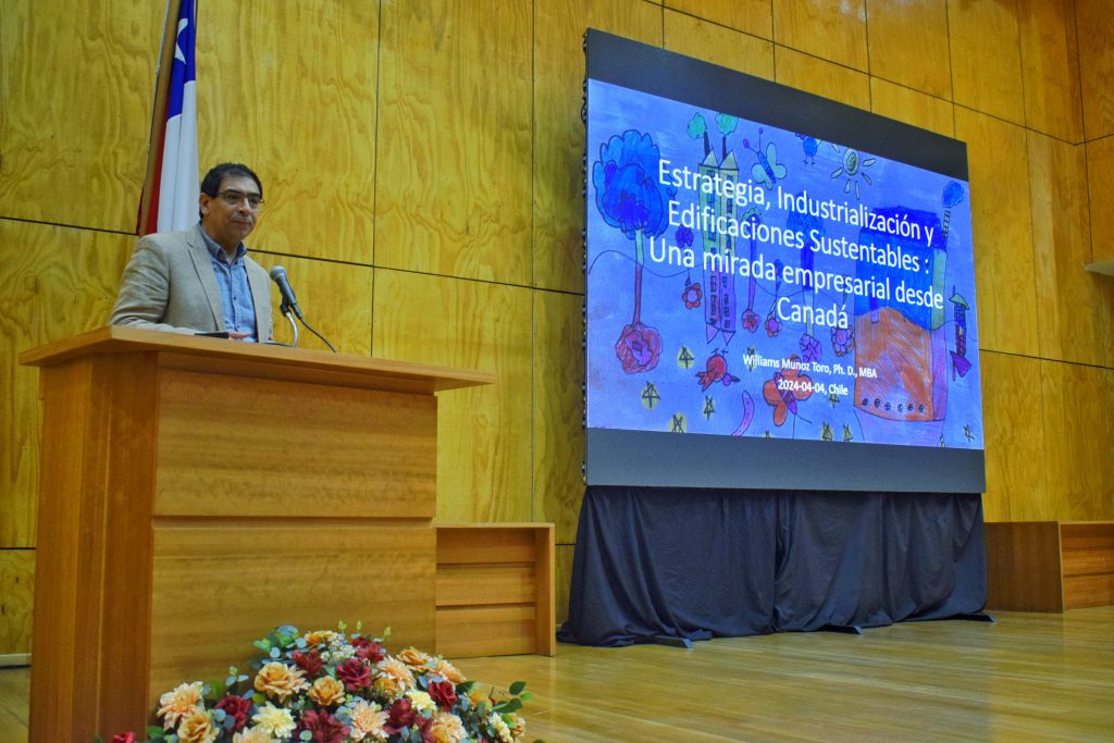 Y la segunda charla, “Estrategia, Industrialización y Edificaciones Sustentables: Una mirada empresarial desde Canadá”, El Dr. Williams Muñoz Toro, destacado ingeniero e investigador, que actualmente trabaja en la prestigiosa compañía canadiense Chantiers Chibougamau. Desde esta empresa lidera la coordinación de actividades de desarrollo, innovación, financiamiento, inteligencia de negocios, y vigilancia estratégica, vinculados a la cadena de valor de la construcción industrializada con madera y productos de ingeniería sustentables. Su exposición se enfocó básicamente en señalar estrategias focalizadas en la industrialización de edificaciones sustentables con la idea de invitar a una reflexión centrada en una nueva línea de negocios para la industria constructiva.
