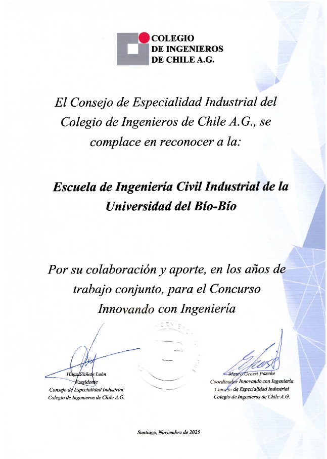 La Escuela de Ingeniería Civil Industrial de la Universidad del Bío-Bío recibió un reconocimiento por parte del Colegio de Ingenieros de Chile A.G., distinción que destaca su colaboración y compromiso permanente en el desarrollo del Concurso “Innovando con Ingeniería”, instancia que moviliza a estudiantes de todo el país en la búsqueda de soluciones innovadoras para desafíos reales de la ingeniería.