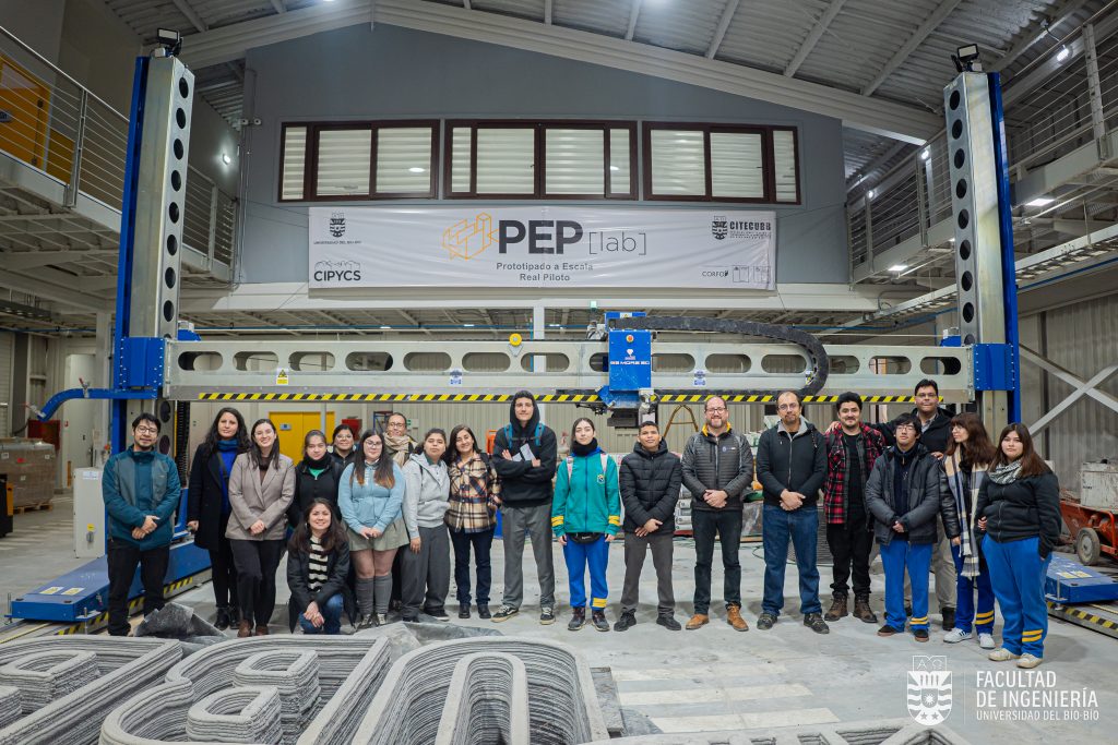 Luego, la visita continuó en el Laboratorio de Prototipo a Escala Real Piloto, PEP Lab, del Centro de Investigación en Tecnologías de la Construcción (CITEC) de la UBB, donde el Ingeniero a cargo, Sr. Juan Guillermo Sandoval, mostró a los visitantes el brazo robótico industrial y la impresora de 3D de gran escala, orientada a la construcción de viviendas por construcción aditiva, tecnologías de las más avanzadas a nivel latinoamericano.