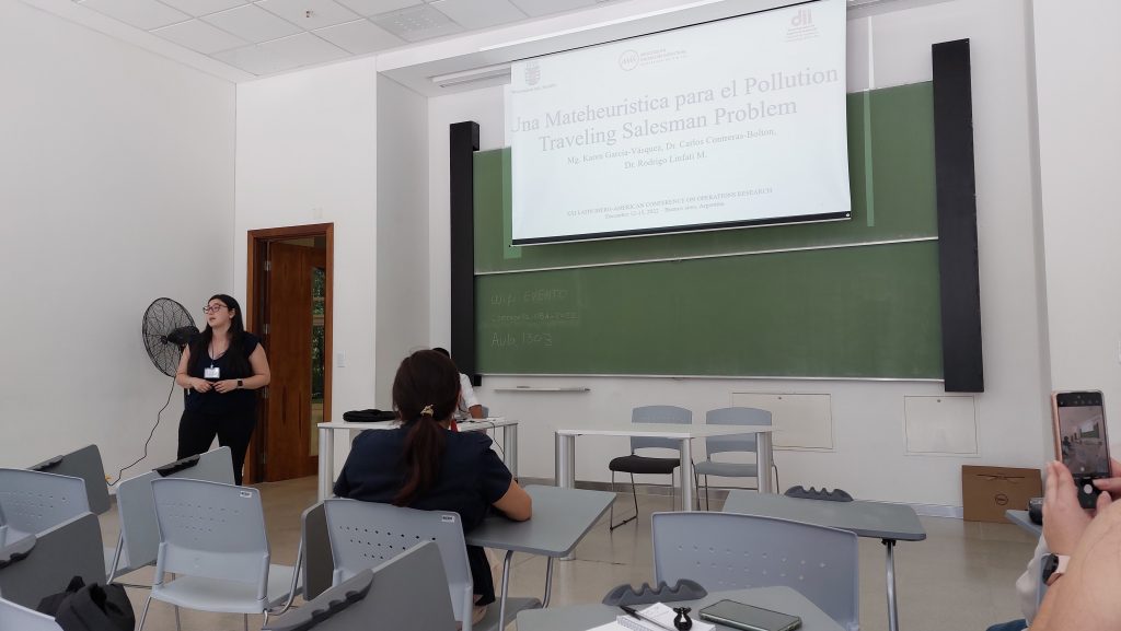 Esa misma jornada también fue el turno de Karen García con “Un Modelo matemático y una metaheurística para una nueva variante del Pollution Traveling Salesman Problem” Seguida por el académico Fredy Troncoso con “Finding Criminal Groups in Suspect Networks”. Mientras que el 13 de diciembre Richard Riffo presentó su investigación “El problema del ruteo de un furgón escolar, generalizado, selectivo, con carga mixta y ventanas de tiempo”. Luego llegó el turno del profesor Rodrigo Linfati con “Evaluación de la programación laboral a través de un modelo de optimización multiobjetivo en el contexto de la pandemia COVID-19”. Finalmente, el 15 de diciembre, la exalumna Natalia Villanueva. presentó “The Multiperiod Set Team Orienteering Problem with Time Windows”.