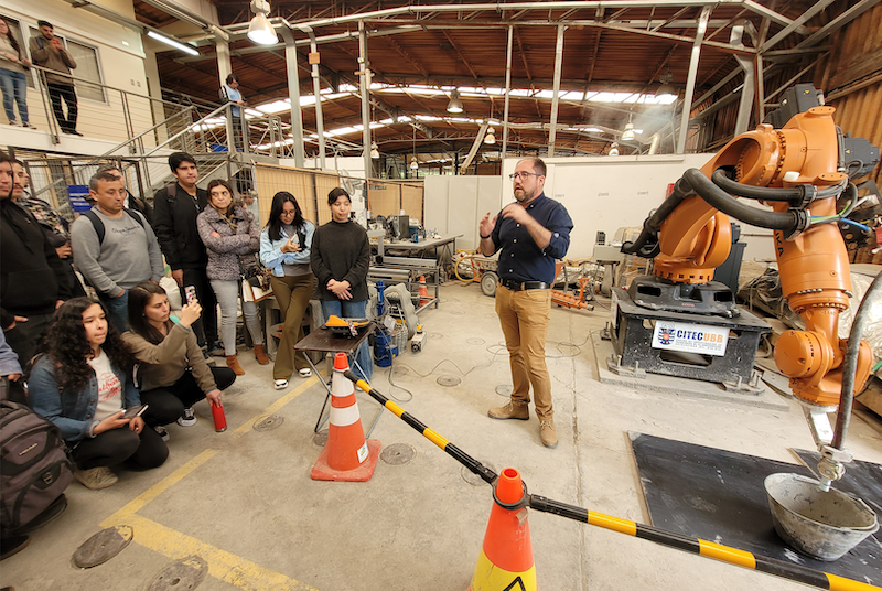 Posteriormente se realizó un recorrido por el Laboratorio de Prototipado PEP [Lab] de la UBB, instancia en que Juan Guillermo Sandoval, integrante de equipo CITEC UBB, efectuó una demostración a los/as asistentes sobre el trabajo del Brazo Robótico KUKA KR120 R2500 para prototipos de elementos constructivos de impresión 3D.
